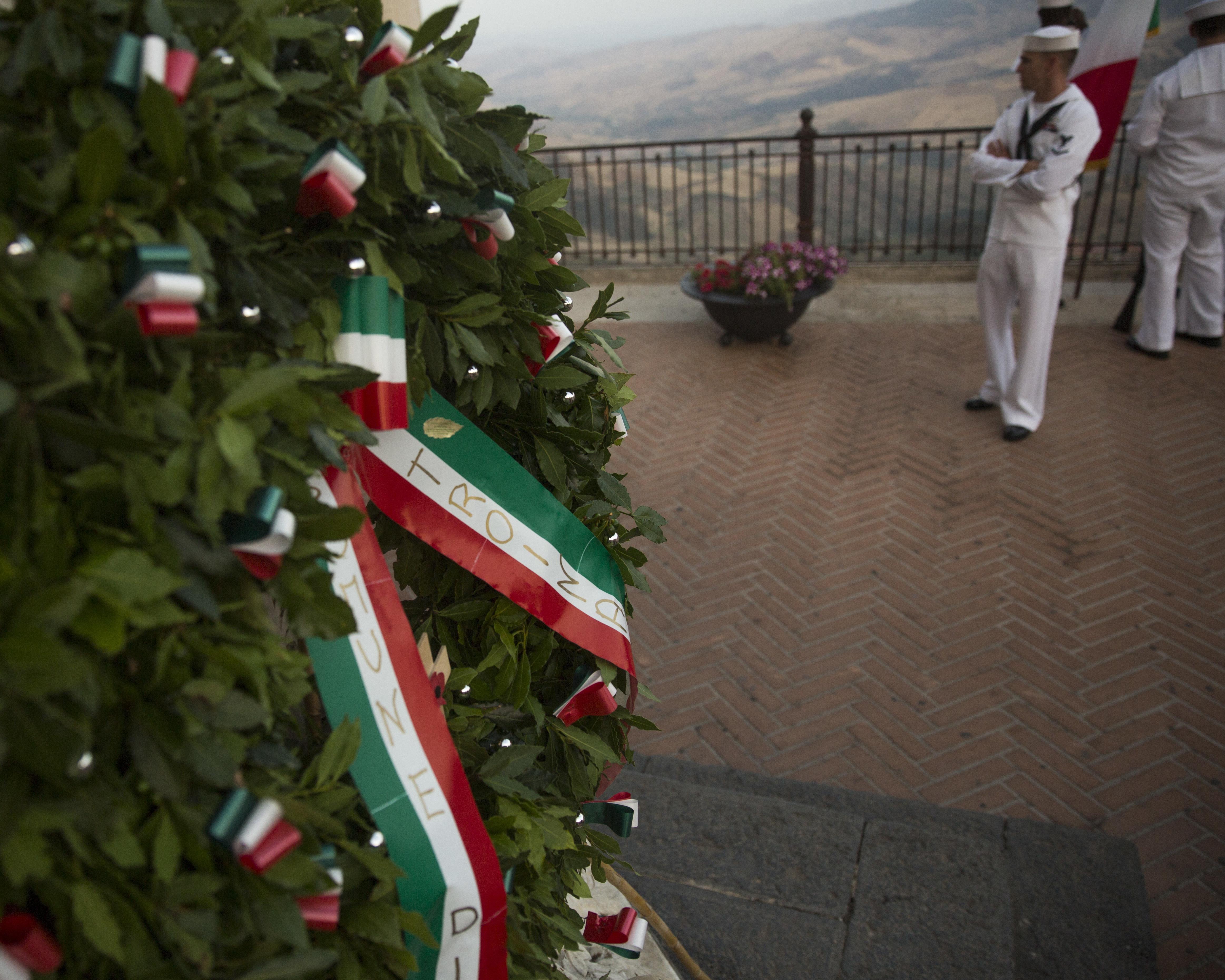 A wreath is laid at the foot of a statue in the center of the town of Troina, Sicily, Italy overlooking the mountains during a World War II remembrance ceremony, August 2, 2015. Every year the town of Troina commemorates and honors the lives lost and remembers the values that won that battle in 1943. (U.S. Marine Corps photo by Cpl. Olivia McDonald/Released)