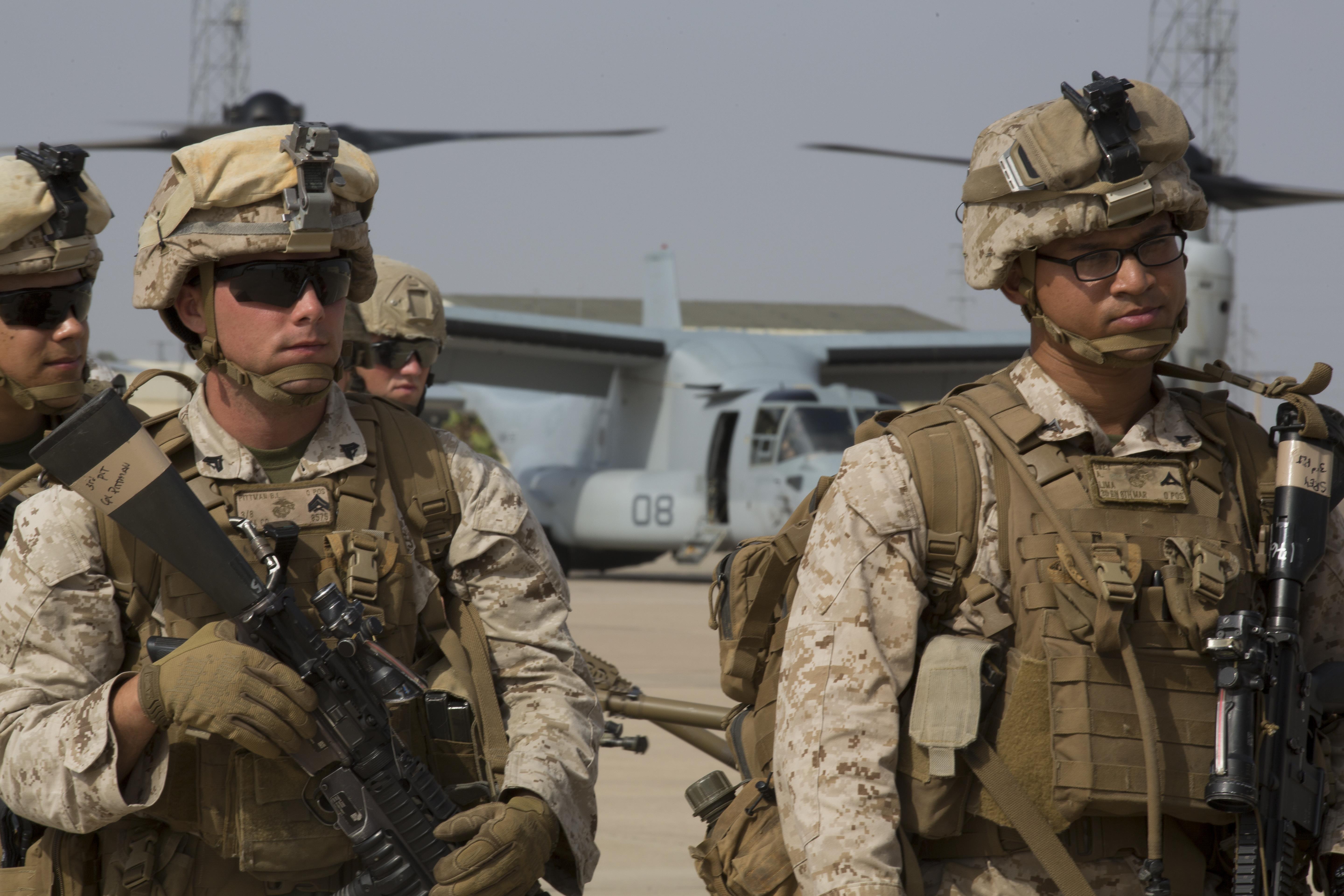 U.S. Marines with Special-Purpose Marine Air-Ground Task Force Crisis Response-Africa (SPMAGTF-CR-AF), board an MV-22B Osprey, during a crisis response drill on Morón Air Base, Spain, Aug. 3, 2015. The crisis response force’s mission requires them to have Marines ready to respond within six hours of an alert in support U.S. Africa Command. (U.S. Marine Corps photo by Staff Sgt. Keonaona C. Paulo/Released)